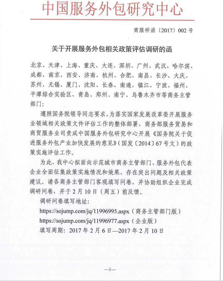 關(guān)于開展服務外包相關(guān)政策評估調(diào)研的函