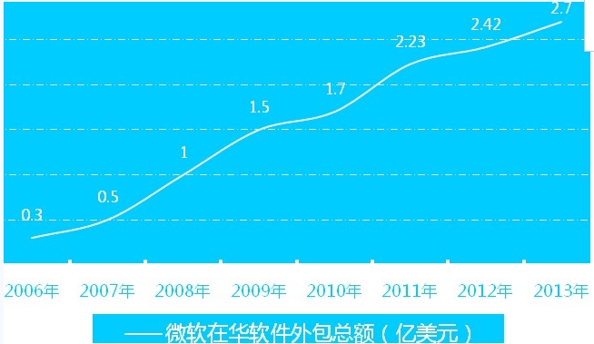 -過去幾年里,微軟持續(xù)增加對中國的全球軟件外包支出,具體金額從2006財年的3,000萬美元飆升至2013財年的2.7億美元(如下圖),僅七年時間便增長了9倍。